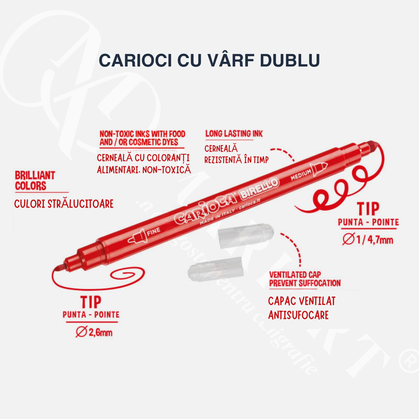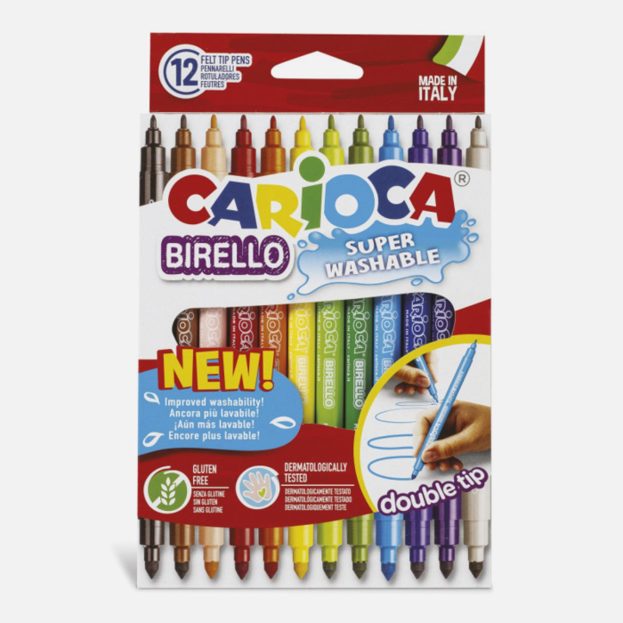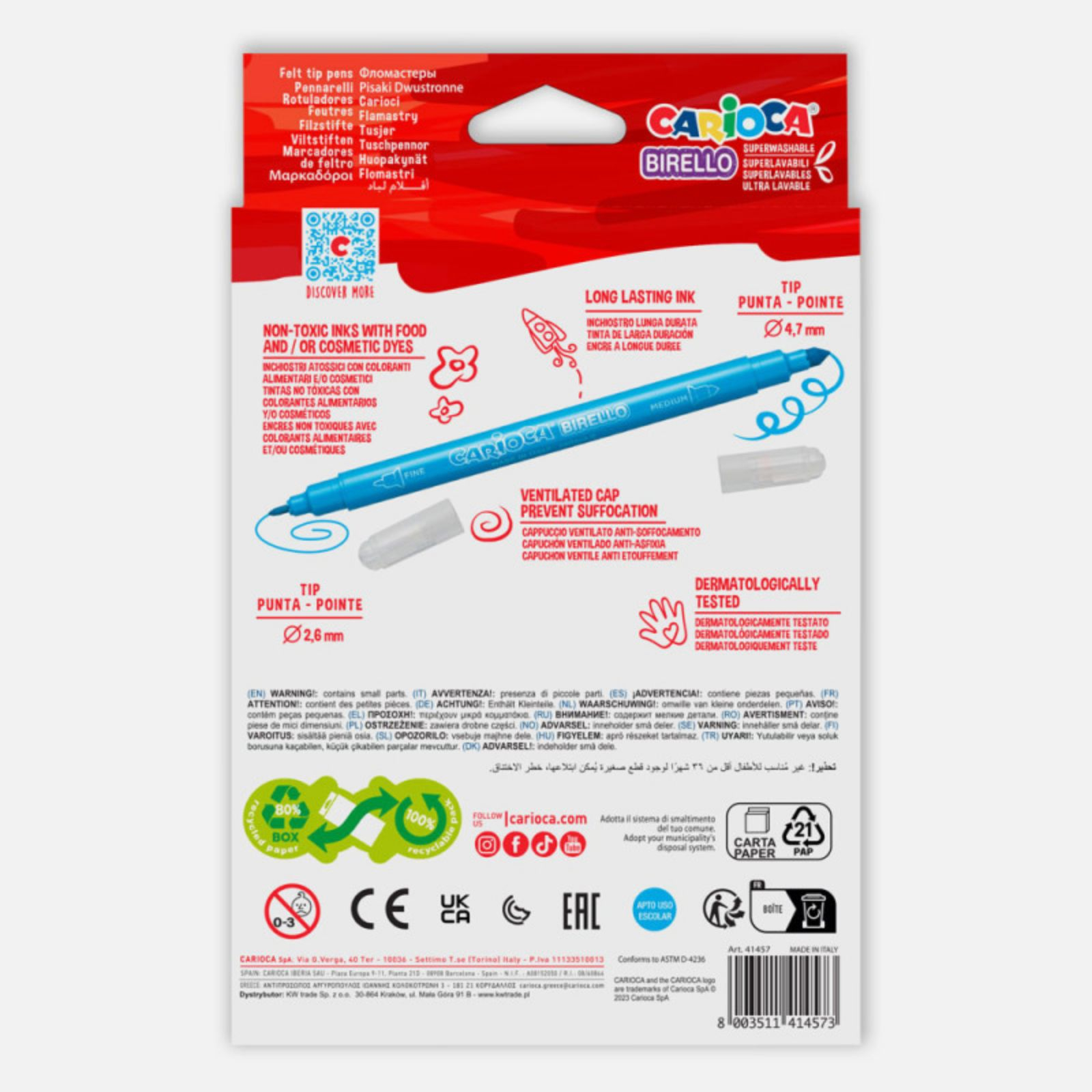Cariocile Carioca Birello sunt alegerea ideala pentru copiii care vor mai multa libertate in desen si colorat. Datorita designului cu doua capete, aceste carioci ofera doua functii intr-un singur instrument: un varf subtire pentru detalii si contururi precise si un varf gros pentru colorarea rapida a suprafetelor mari.