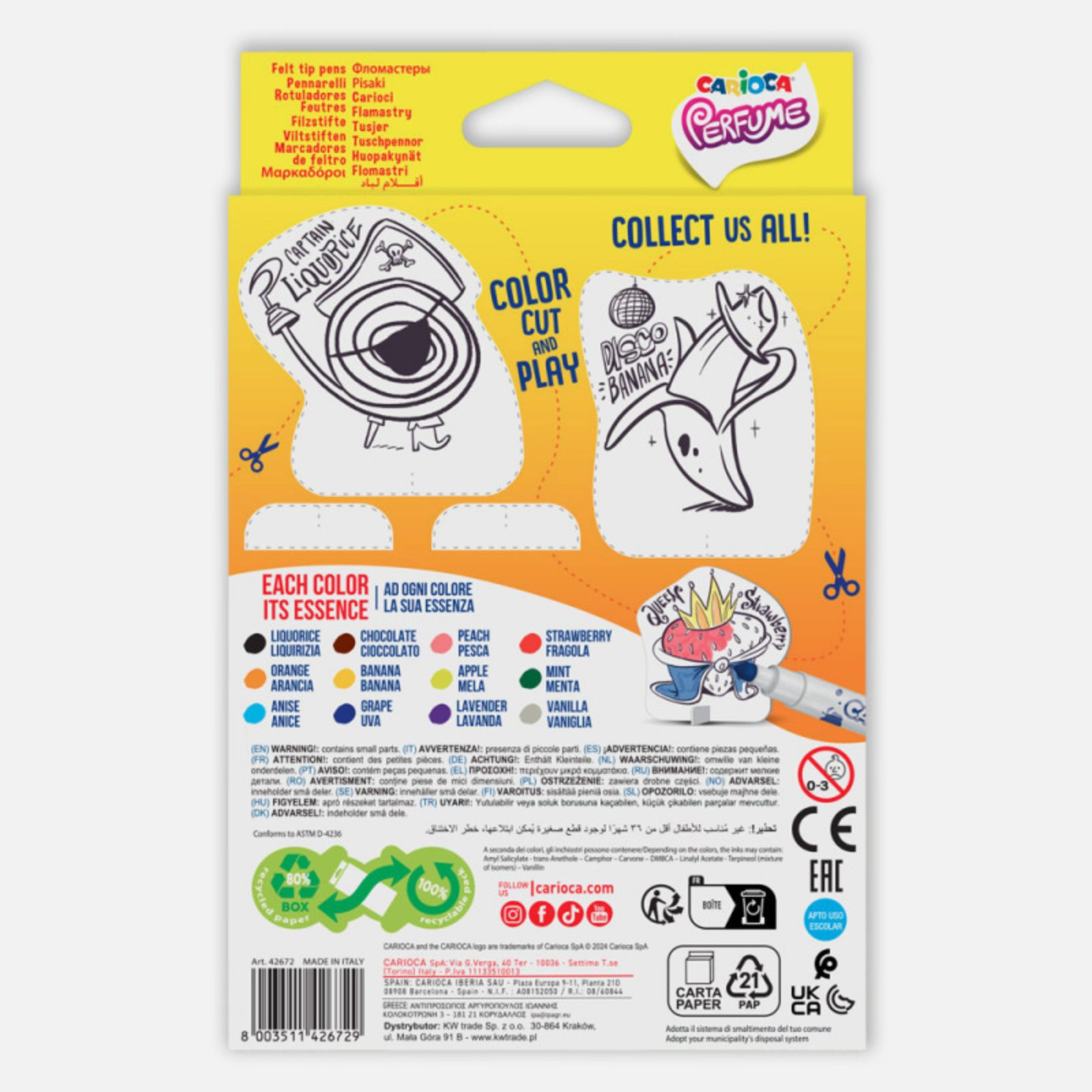 Fiecare carioca are un parfum distinct – de la fructe precum capsuna, banana sau portocala, pana la arome precum ciocolata, vanilie sau menta. Astfel, copiii nu doar deseneaza, ci interactioneaza cu culorile intr-un mod multisenzorial, ceea ce stimuleaza imaginatia si interesul pentru activitatile creative.