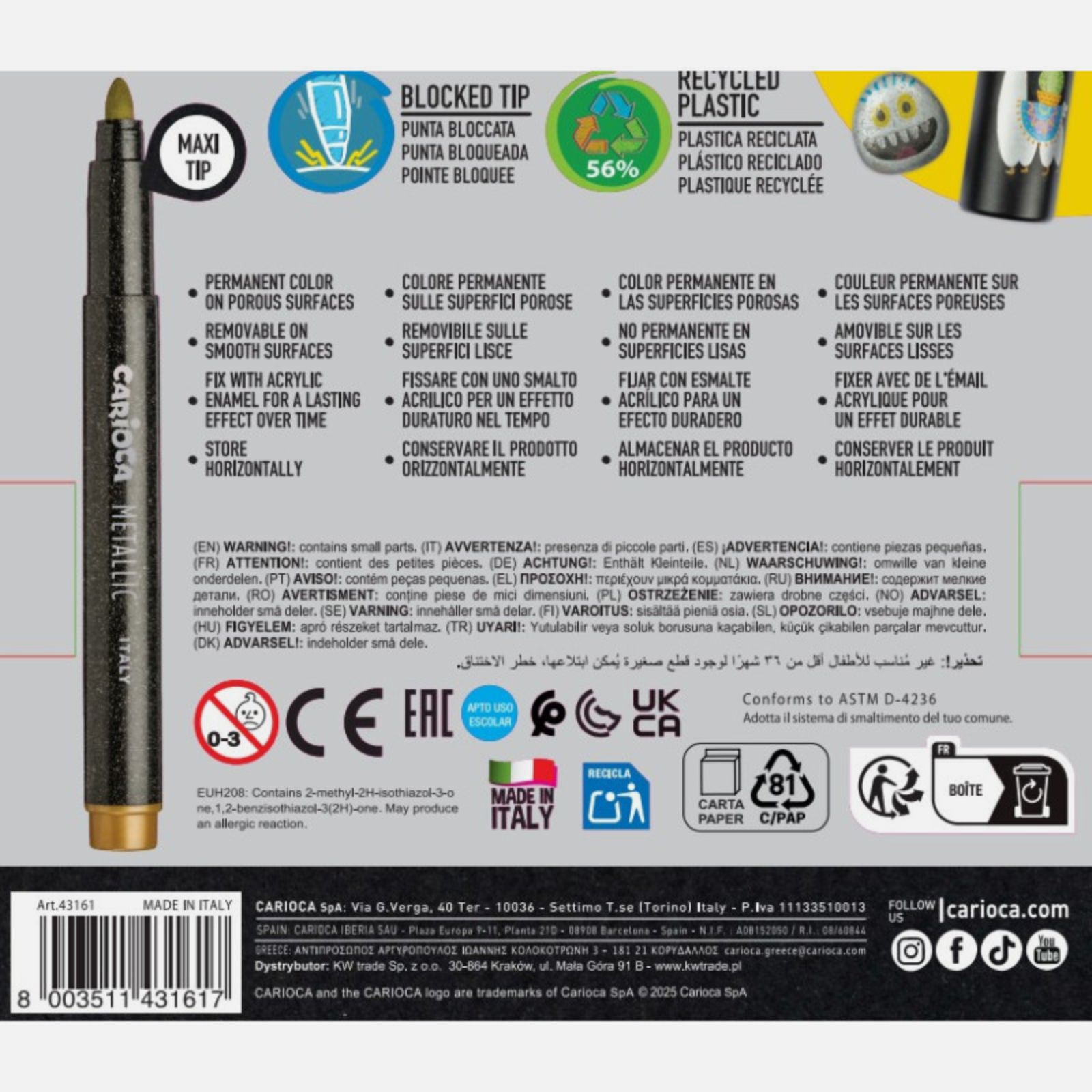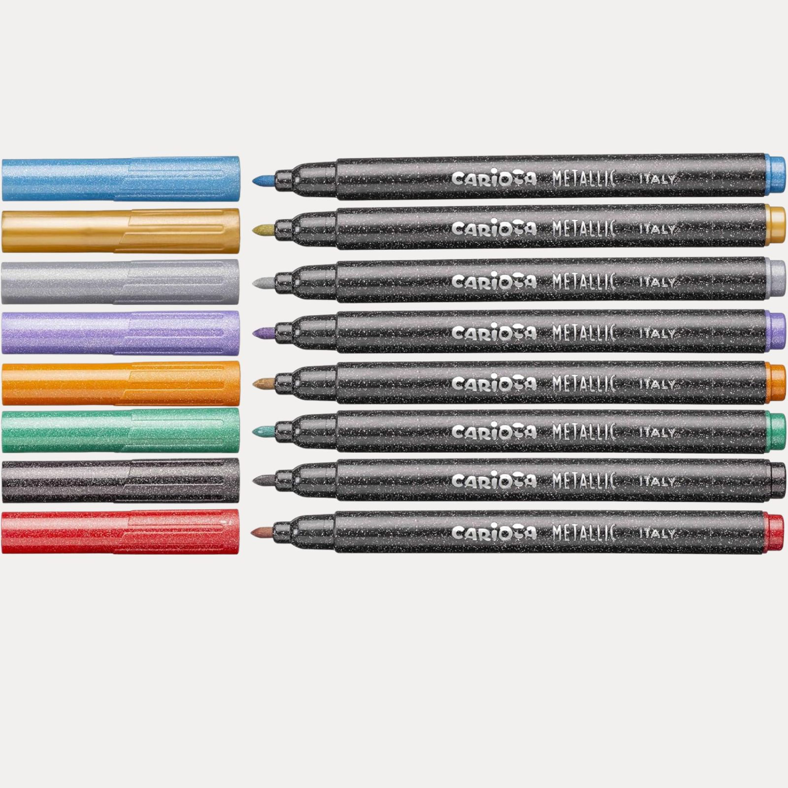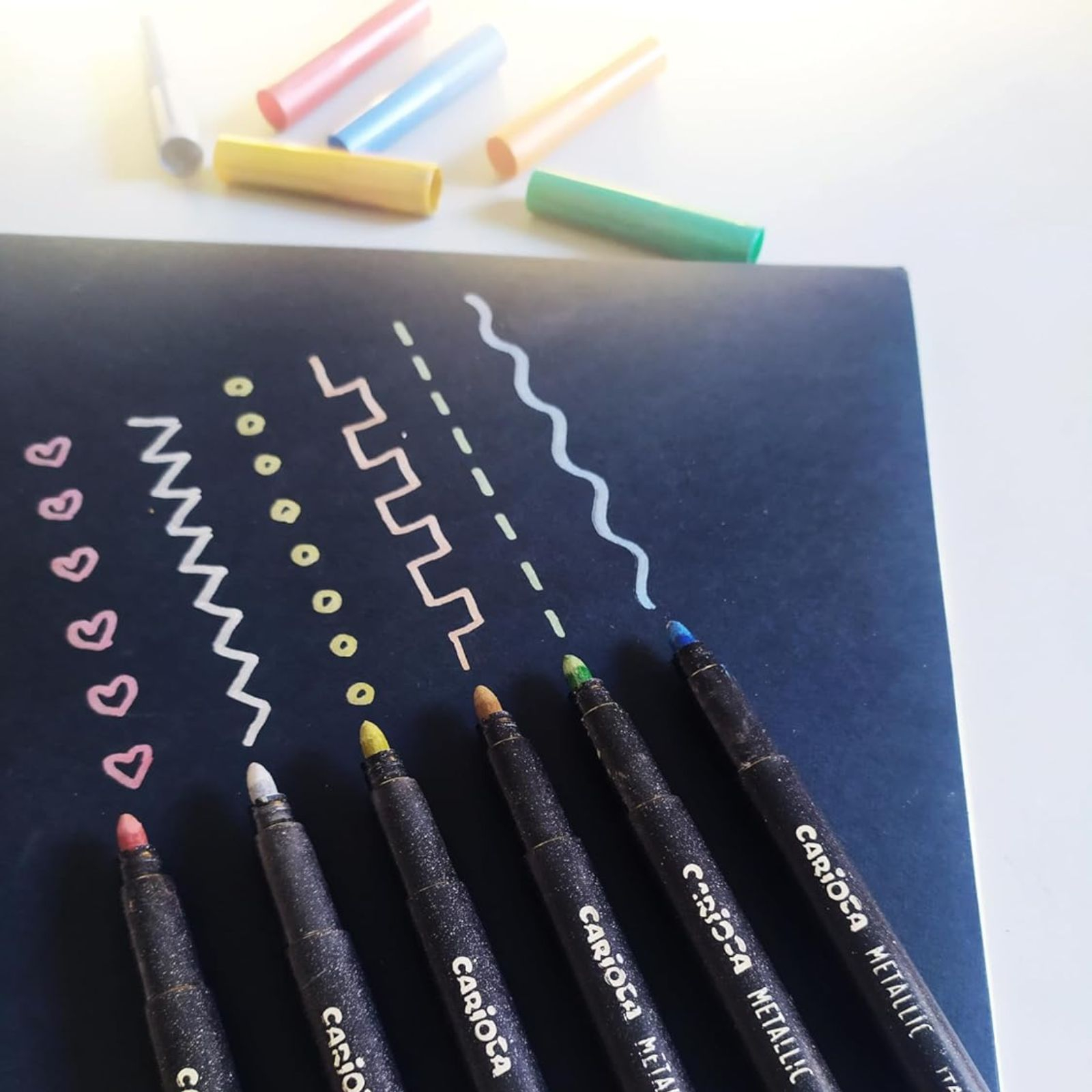 Acest set de carioci metalice transforma orice desen intr-un efect vizual premium. Culorile au un finish stralucitor, care se vede perfect chiar si pe suprafete inchise la culoare.