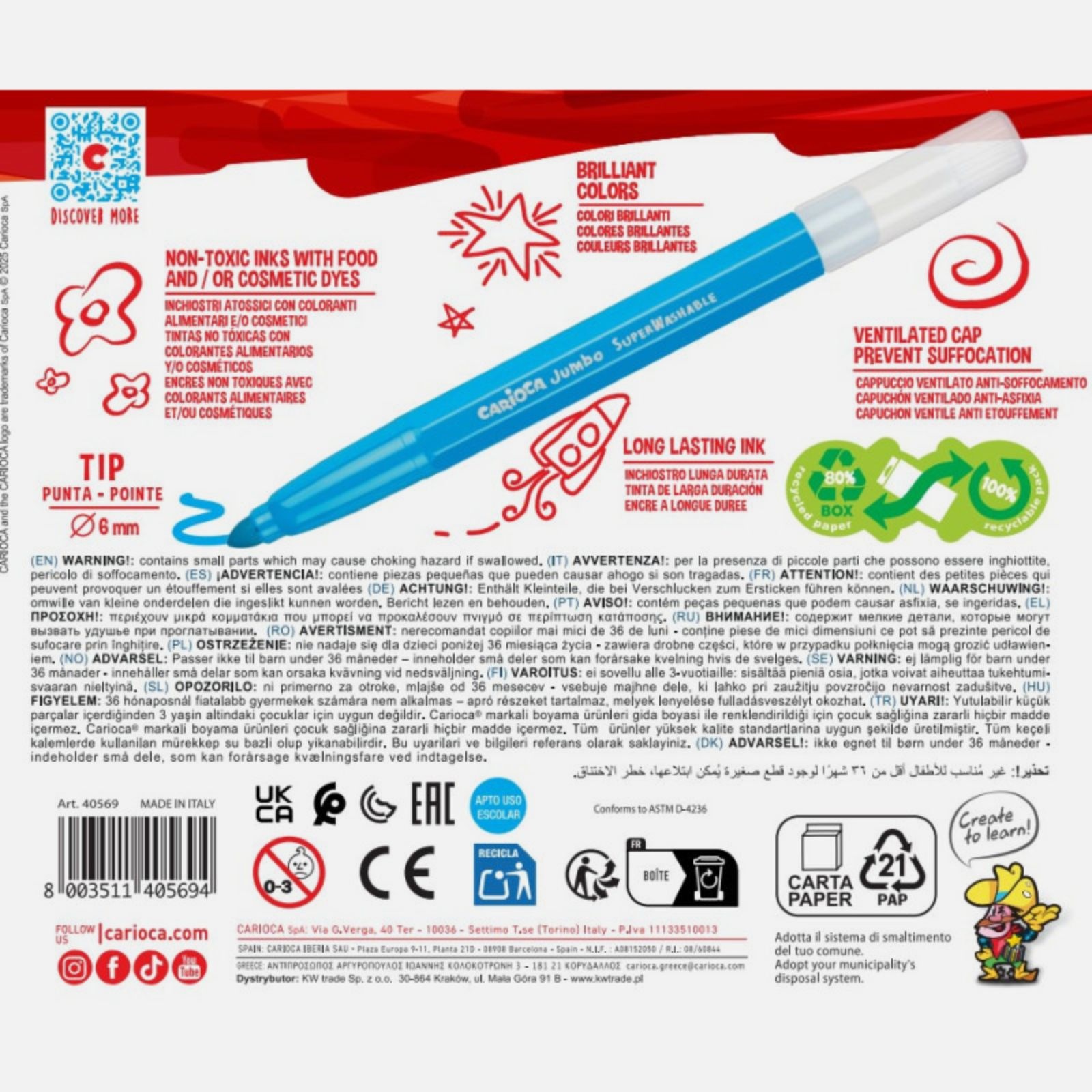 Cariocile Carioca Jumbo super lavabile sunt alegerea ideala pentru copiii mici care descopera lumea desenului. Concepute special pentru maini mici si utilizare intensa, aceste carioci ofera combinatia perfecta intre usurinta in utilizare, culori intense si siguranta.