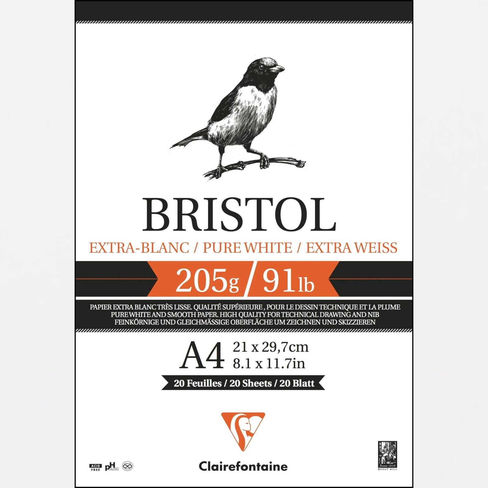 Blocul de desen Clairefontaine Bristol Extra White este alegerea ideala pentru artisti, ilustratori si designeri care cauta o hartie de calitate superioara, cu o suprafata perfect neteda si rezistenta. Fabricat din 100% celuloza, acest tip de hartie Bristol ofera o textura extrem de fina, potrivita pentru lucrari detaliate si linii precise.