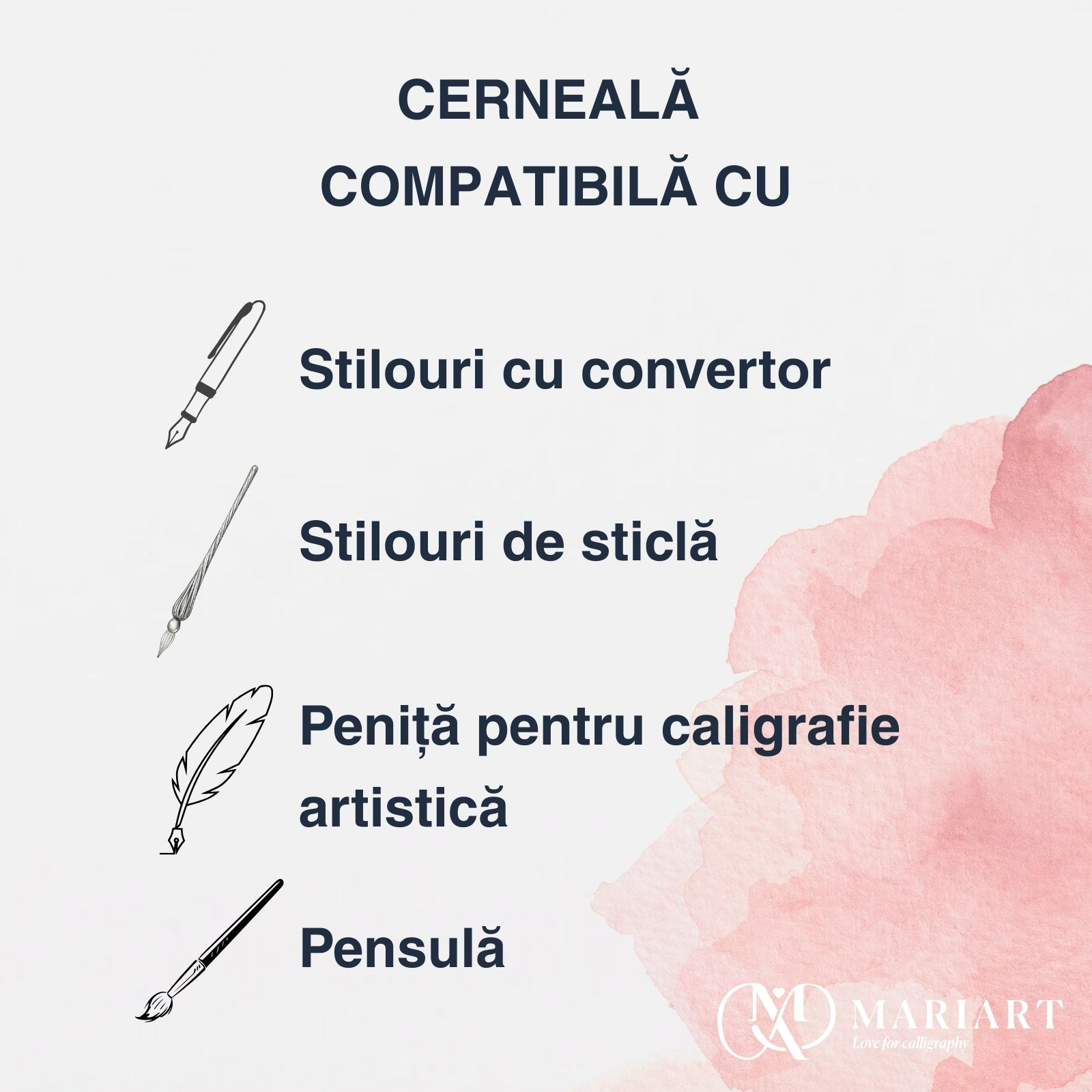 • cerneala neagra pentru caligrafie cu tocul si penita, stilou de sticla, pensula